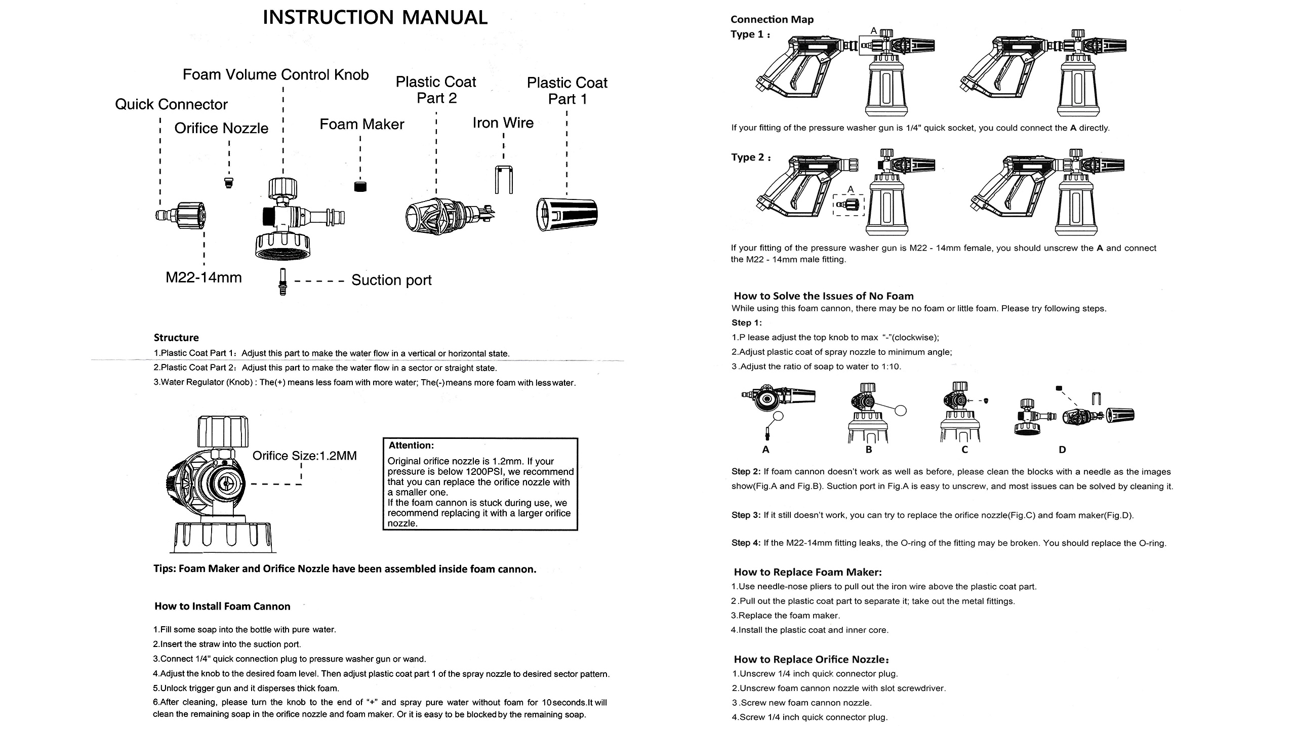 1.2mm orifice pre-installed, plus extra 1.1mm orifice for thicker foam at lower GPM pressure washers